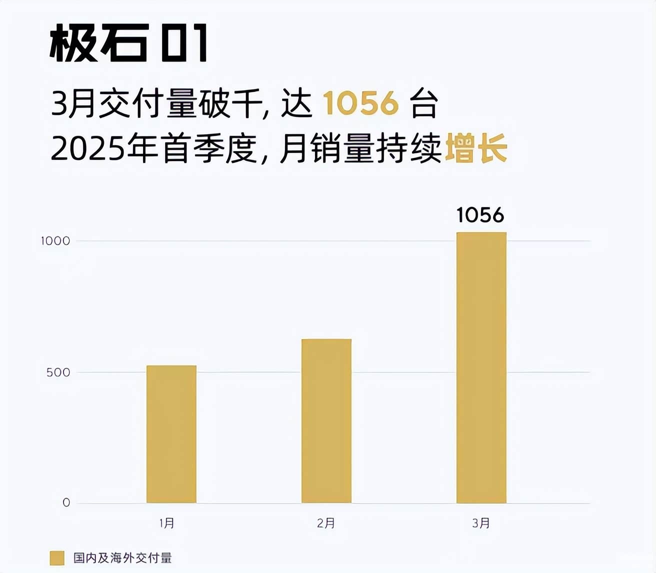 公开数据显示,今年3月份,极石汽车的交付量为1056辆,至于今年第一季度的具体销量,极石汽车并没有对外公布,只是称“2025年首季度,月销量持续增长”。从柱状图来看,一季度极石汽车累计销量应该也就两千出头,月均销量还不到八百辆。