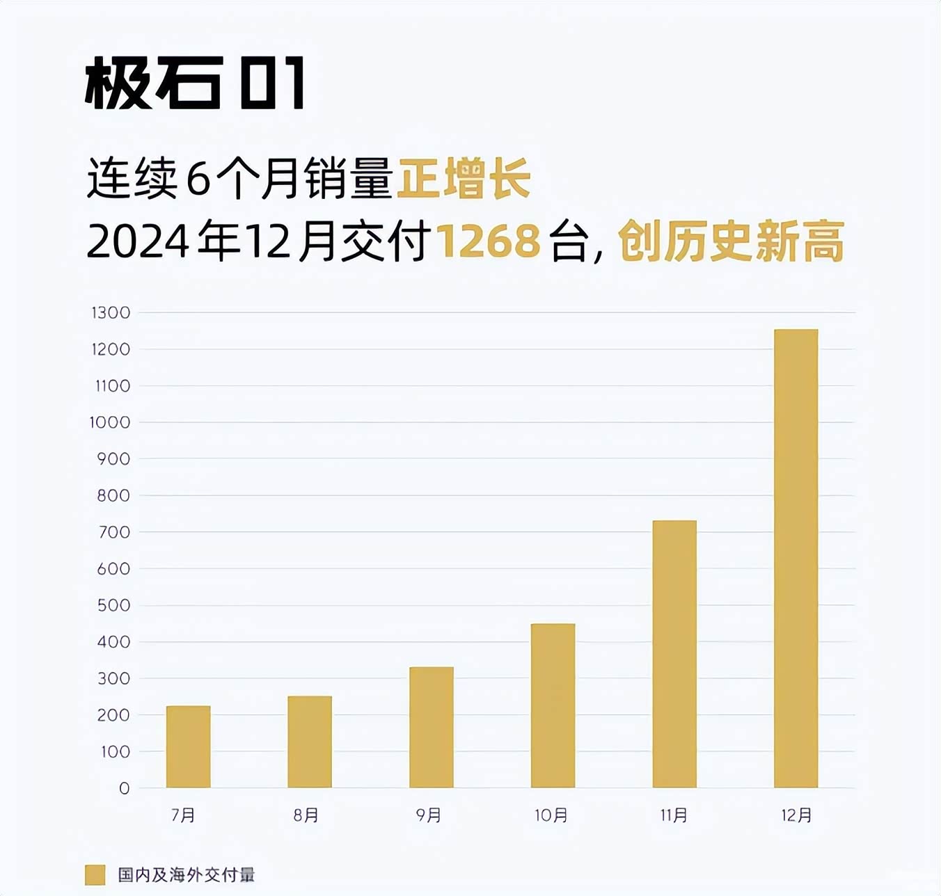 值得一提的是,极石汽车官方鲜少公布具体销量,其公众号上一次公布销量还是去年12月。数据显示,2024年12月份,极石汽车的销量为1268辆,虽然只是突破千辆,但这样的成绩已经是极石汽车的单月销量历史新高了。