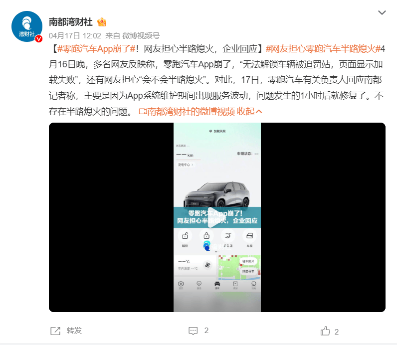 同日,零跑汽车客服回应媒体称,“目前App已经恢复正常,之后公司会不断提升产品及服务水平。很抱歉给广大零跑车主带来不好的体验。”