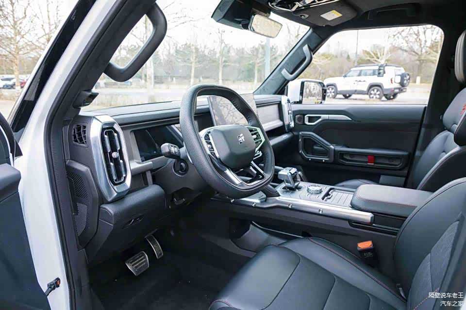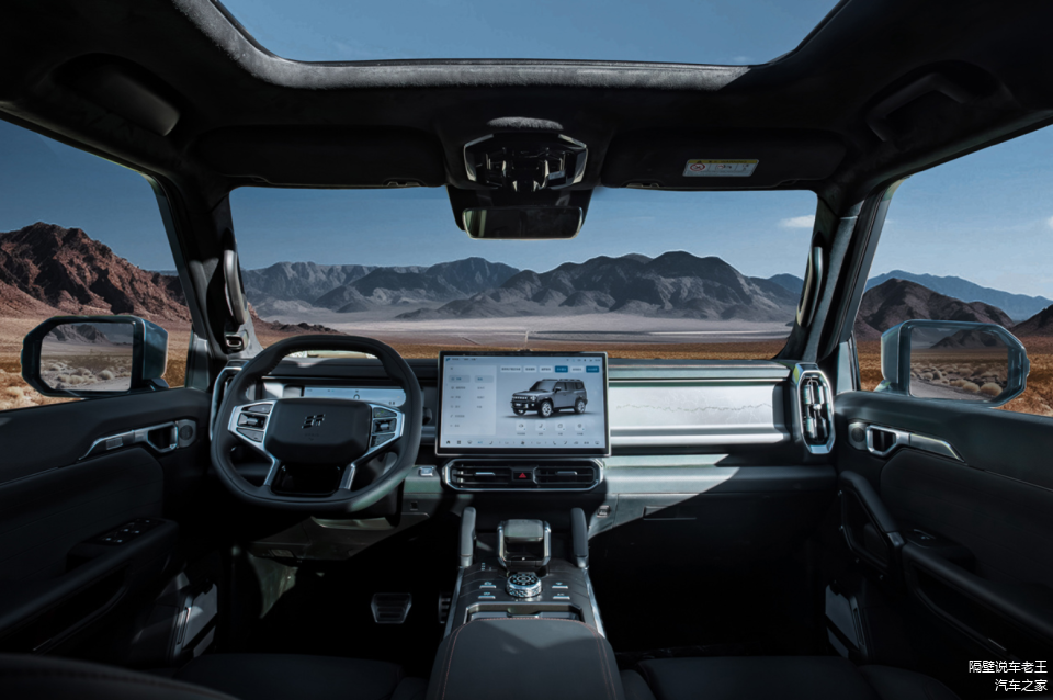 坐进驾驶舱,第一感觉就是这车内饰用料真舍得。中控台和门板大面积软包,副驾驶前面那块镂空金属饰板还雕刻着能点亮的318国道线路图,这细节设计直接把仪式感拉满。全车12处扶手的设计在越野颠簸路段特别实用,A柱、车顶篷这些地方都装了,比坦克300考虑得更周到。15.6英寸中控大屏配高通8155芯片,操作流畅度比坦克300那套系统强不少,还支持HUAWEI HiCar和CarPlay,不管用苹果还是华为手机都能无缝连接。