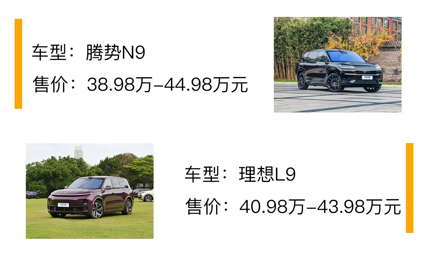 这其中,刚刚上市不久的腾势N9与老牌家用代表的理想L9,近期难住了我们的一位粉丝朋友:前者融合了比亚迪新能源技术深厚底蕴与奔驰豪华基因;后者凭借增程式电动技术和丰富的智能配置,在家庭用车市场独树一帜。最关键的是两款车型价格高度重叠、都定在了40万元区间,同样以“9”为名的旗舰定位、产品层面的BUFF叠满,这两款SUV谁才是你的菜?