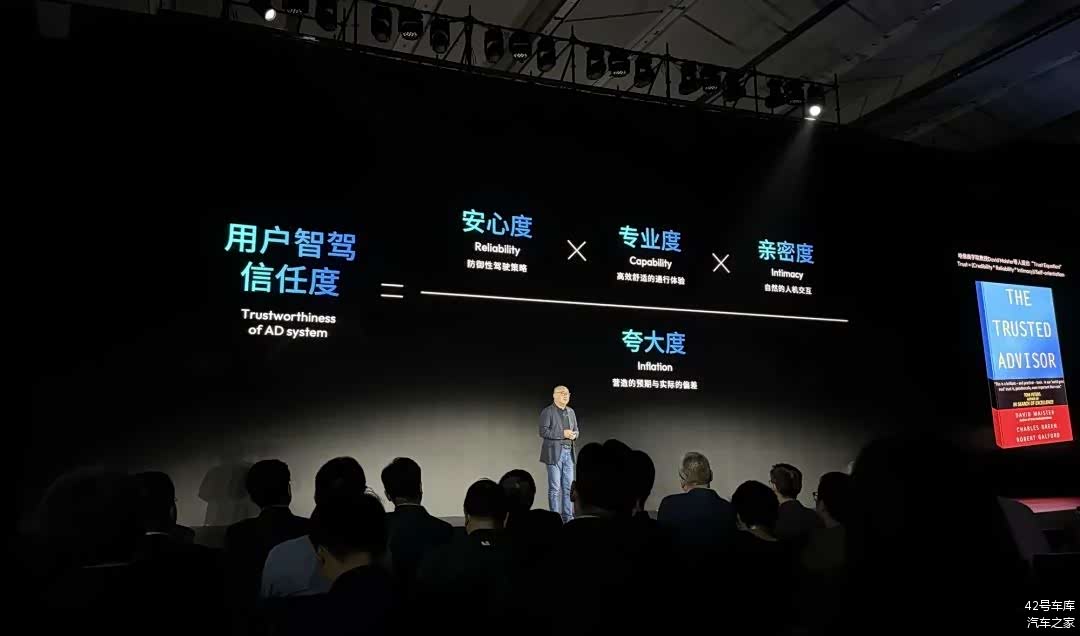 通过大量的视频,余凯希望 HSD 是一套体验类人同时也让用户信任的城区辅助驾驶系统。他列出了一个公式:用户智驾信任度 = (安心度 X 专业度 X 亲密度) / 夸大度。