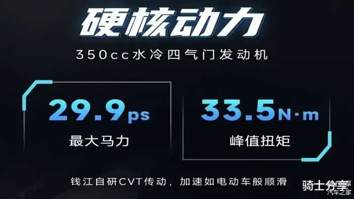 大踏板的另一大优点,说白了就是动力性能,不然无异于小马拉大车,中看不中用。钱江讯350所搭载的是一款单缸水冷四气门电喷发动机,该引擎实际排量350cc,最大马力29.9匹,最大扭矩33.5N·m,并配套有钱江自研的CVT传动系统,据说能带来电车般顺滑的加速体验,和理想的动力输出。