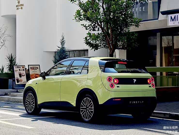 萤火虫长宽高分别为 4003*1781*1557 毫米,轴距为 2615 毫米,小巧的车身尺寸在城市中穿梭更加灵活。从侧面看,萤火虫采用四轮四角车身布局,A/B 柱以及车顶、外后视镜、后扰流板均采用了黑色涂装,营造出悬浮车顶的视觉效果。此外,新车还配备了前翼子板摄像头、隐藏式车门把手以及独特的轮圈造型。车尾部分,“三重奏” 尾灯风格与大灯相呼应,同样由三个光环组成,后包围应用了大面积黑色材质,搭配车顶扰流板设计以及后窗雨刷器,整体造型拥有很好的立体感。