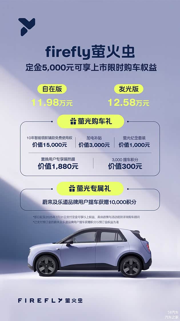 firefly萤火虫为首批用户提供了超值权益:即日起至2025年7月31日前(含)支付定金的用户,可享有萤光购车礼,包括价值15,000元的10年智能领航辅助NOP免费使用权、价值3,000元的加电补贴、价值1,000元的萤光纪念套装、价值300元的3,000提车积分,以及价值1,880元的置换用户专享车窗隔热膜。同时,蔚来及乐道品牌用户提车,可额外获赠10,000积分的萤光专属礼。此外,用户购车可享0首付、5年期年化费率低至2.59%。