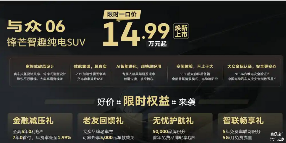 近日,从官方渠道获悉,2025款与众06正式上市。作为ID.UNYX系列的年度更新产品,新车共推出4款车型,厂商指导价为18.99万至24.99万元,同时提供限时优惠,起售价调整为14.99万元,顶配车型限时售价为20.99万元。