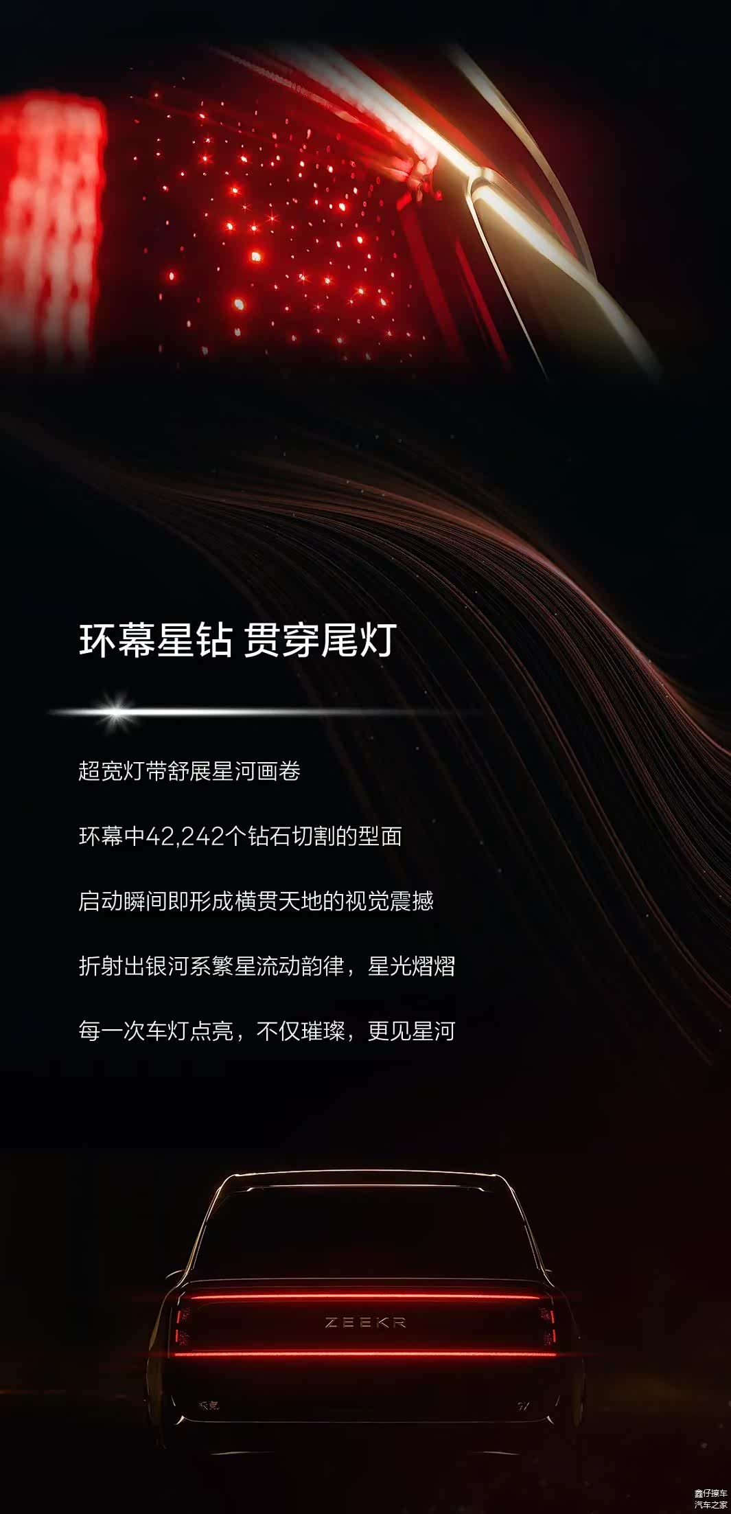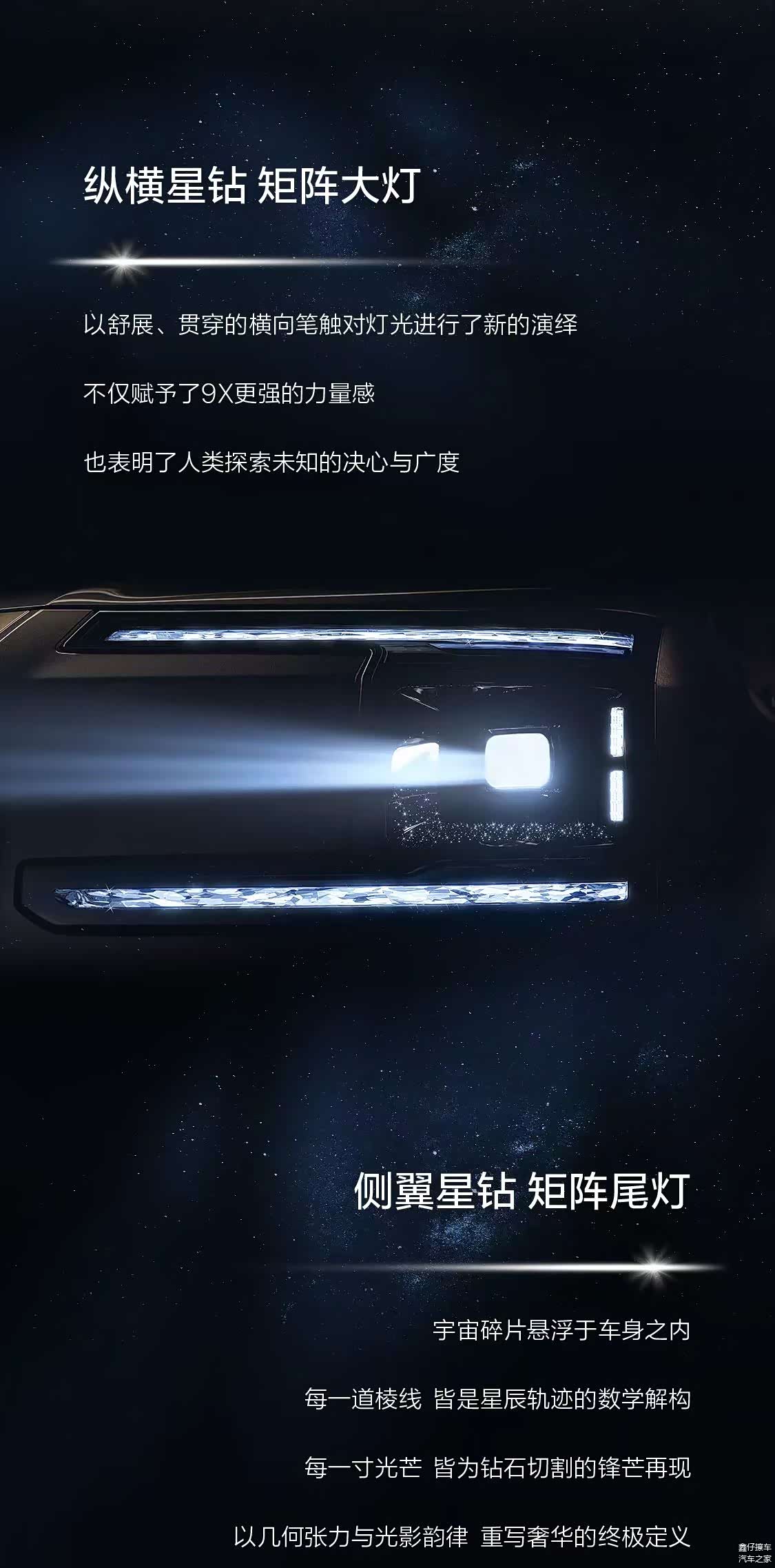车尾方面,新车配备了环幕星钻贯穿尾灯,环幕中拥有43343个钻石切割型面,点亮后极具辨识度。此外,新车尾灯组命名为侧翼星钻矩阵尾灯,与车头形成呼应。