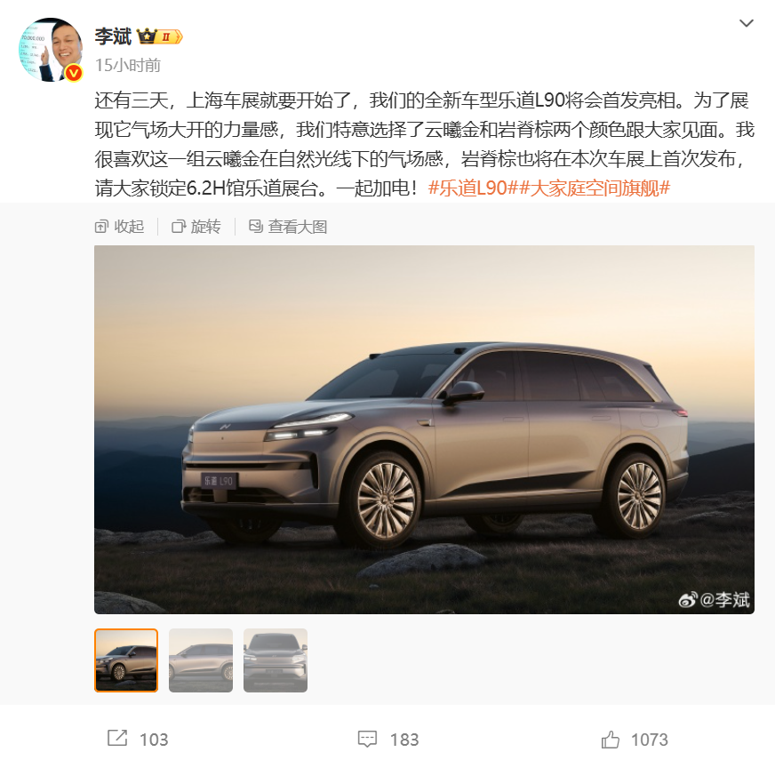 4月20日,蔚来创始人、董事长兼CEO李斌在微博上分享了一组乐道L90云曦金车色的新车图,并且他还透露了一款全新的车色——岩脊棕,同时宣布新车将在上海车展首发亮相。
