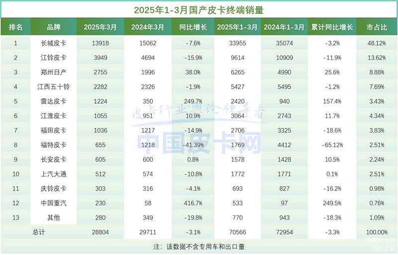 据最新销售数据显示,2025年3月,我国新能源皮卡领域领导者——吉利雷达的终端销量为1224台,环比增长122.3%,同比增长249.7%,跃居国产皮卡全品牌销量榜单第五位,在新能源皮卡销量排名榜稳居第一,推动新能源皮卡国内市占率提升至63.2%,并将纯电皮卡在国内新能源皮卡领域的市场份额抬升至83.1%。