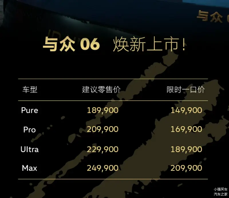 4月21日,汽车市场迎来新动态,大众安徽的 与众06(图片 | 参数 | 询价)正式上市。这款车可以看作是ID. 与众的2025款车型,不过名字换成了“与众06”。新车这次带来了不少改变,一共推出了Pure、Pro、Ultra以及Max四款配置车型,官方指导价在18.99万 - 24.99万元之间,要是赶上限时优惠,价格低至14.99万 - 20.99万元 。而且还增加了全新入门版Pure车型,给消费者更多选择。