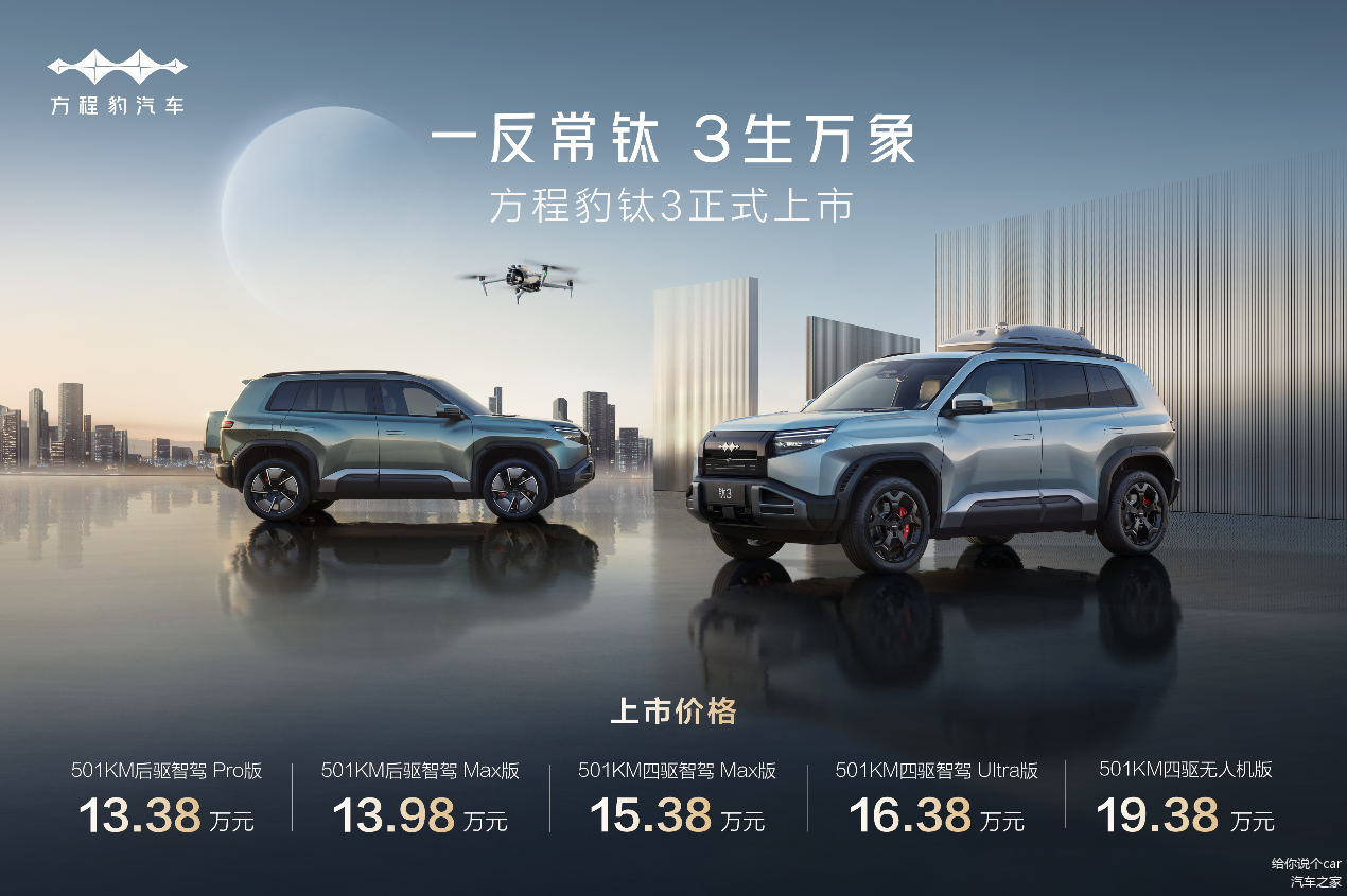 比亚迪旗下个性化品牌方程豹的科技潮品 SUV—— 钛 3 正式上市。此次上市的钛 3 共有 5 个版本,起售价为 13.38 万元。