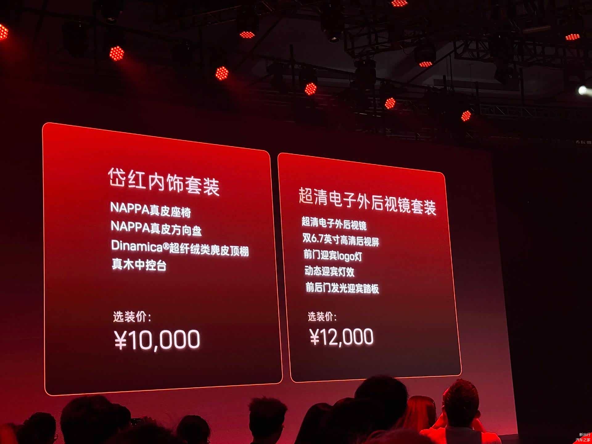 新车提供内饰及外后视镜选装包。其中岱红内饰套装选装价格 10000 元,超清电子外后视镜套装选装价格 12000 元,详情可参考下图。