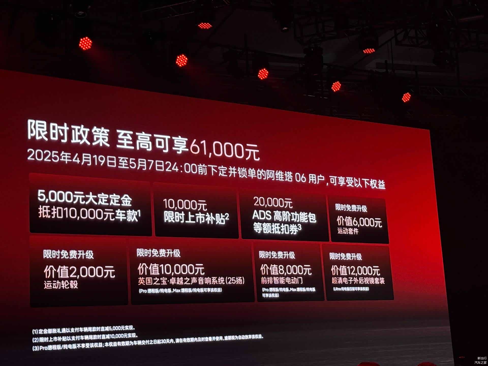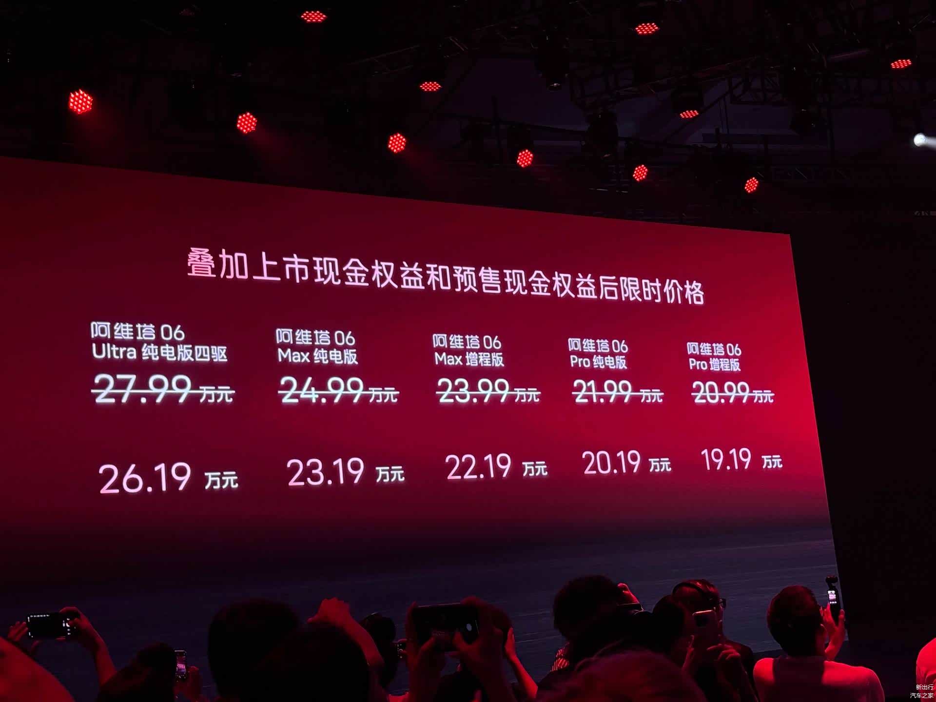 4 月 19 日,阿维塔旗下第四款车型——中型轿跑阿维塔 06 正式上市。新车推出增程/纯电双动力车型,叠加权益后限时售价 19.19-26.19 万元,权益包括首任车主三电终身质保,详情可参考下图。