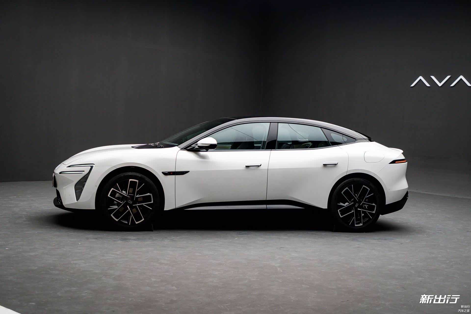 车身侧面,阿维塔 06 整体的车身线条紧凑,上扬的腰线让车身侧面看上去更加的动感。悬浮式车顶的设计也有效的降低车身的视觉高度。车身尺寸方面,新车长宽高分别为 4855/1960/1450mm,轴距为 2940mm。新车将标配 20 英寸轮毂匹配 255/45 马牌高性能胎。