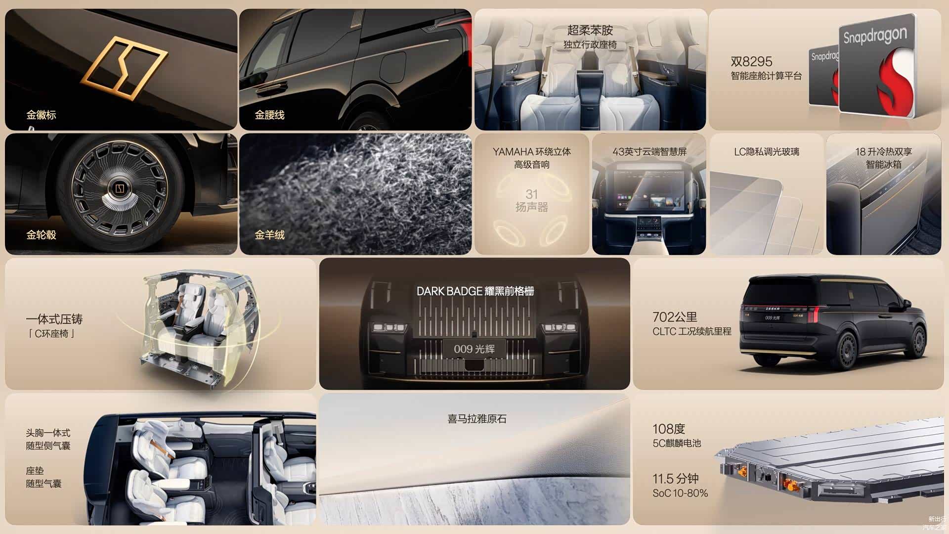 豪华配置方面,009 光辉典藏版采用了 3 克 24K 金打造金徽标,内饰部分配置超柔苯胺座椅、高定羊绒地毯、喜马拉雅原石饰板、20 英寸悬浮曜金定制轮毂等。