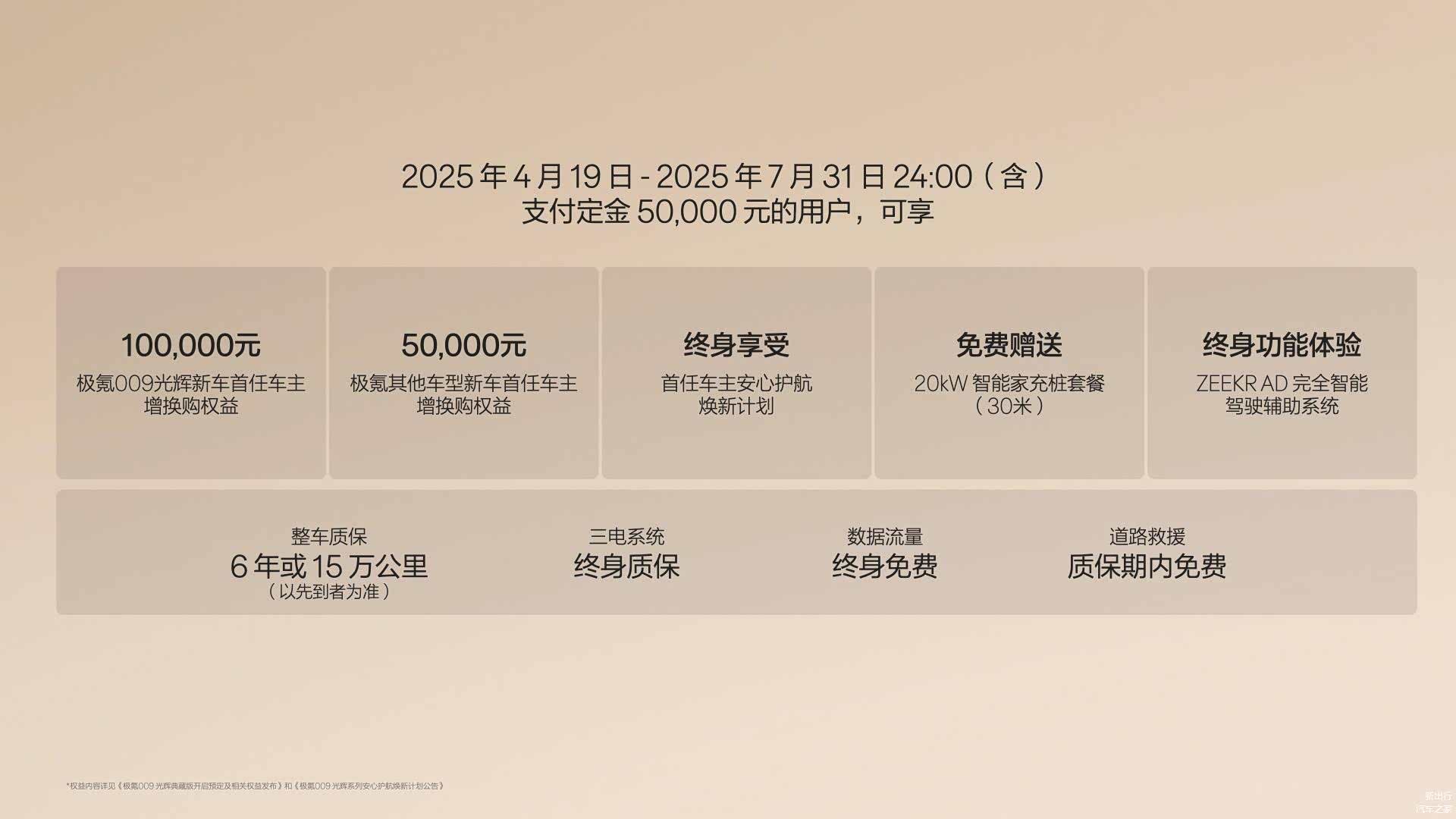 4 月 19 日,极氪 009 光辉典藏版正式上市。新车售价 89.9 万元起,将于 2025 年上海车展正式亮相。相比 009 光辉普通版车型,光辉典藏版主要新增了金色腰线、金色外观饰件,同时各方面舒适和豪华配置都有所升级。新车尊享多项购车权益,详情可参考下图。