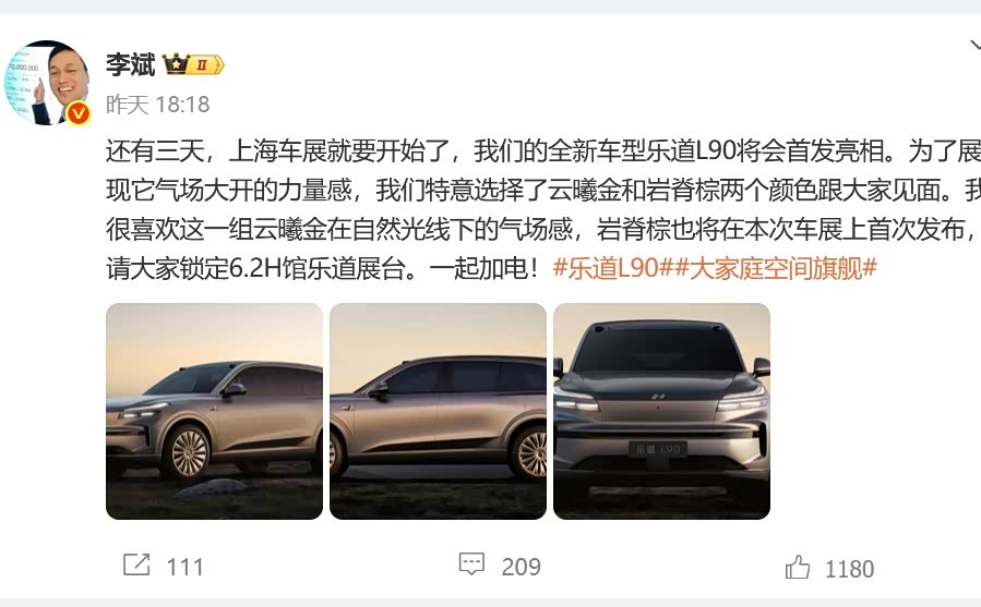 4月20日消息,蔚来创始人、董事长、CEO李斌今日发文透露,全新车型乐道L90将会在上海车展首发亮相,并且特意选择了云曦金和岩脊棕两个颇具特色的颜色与大家见面,吊足了众人胃口。