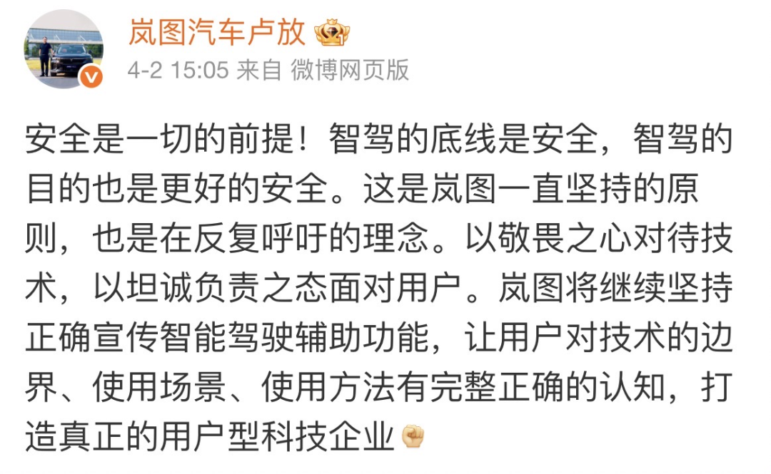 在个人微博,卢放不止一次强调安全才是岚图汽车首先关注的,也不止一次强调“智驾的底线是安全,智驾的目的也是更好的安全。”