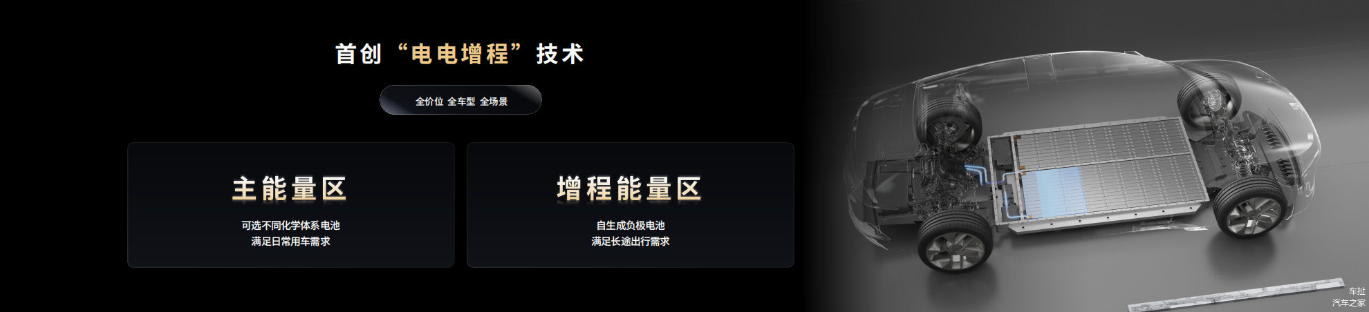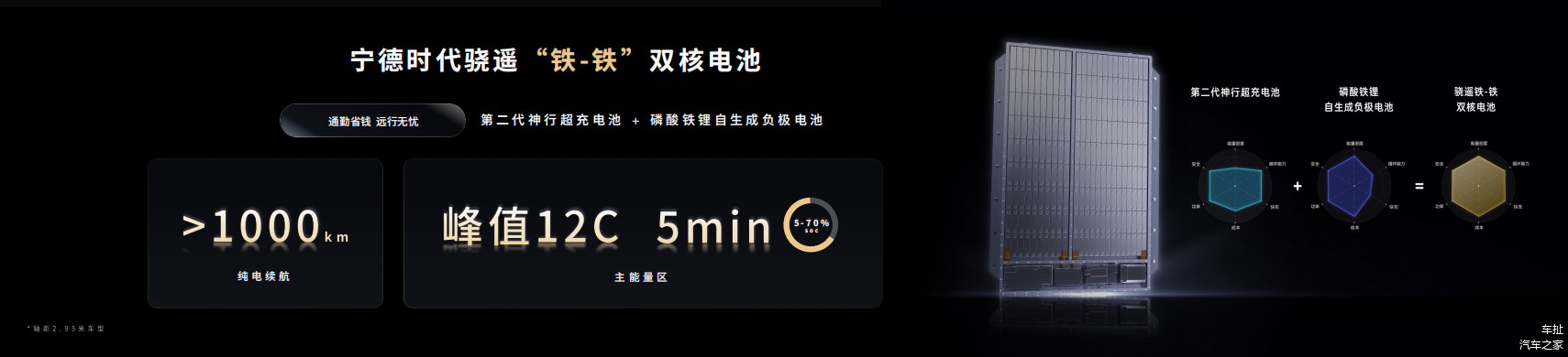 此次发布会的重头戏,则是宁德时代推出的采用双核架构、自主成负极技术的骁遥双核电池。其在高压、低压、结构、热管理以及热失控安全防护领域均采用双核设计,为车辆的动力电池留足冗余,更好的保障安全。同时,通过独特的“电电增程”技术,该电池可智能调控两个能量区的分配策略,更为充分的发挥不同电芯的化学特性和优势。