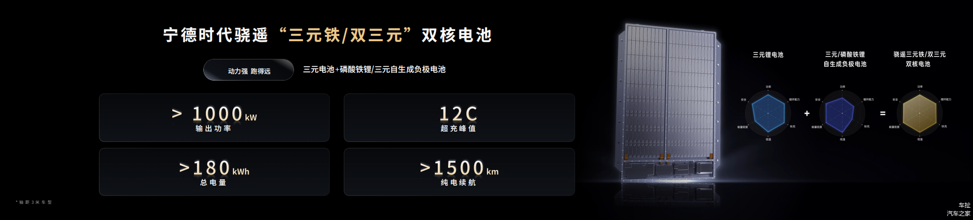 最后的三元铁/双三元双核电池则由三元电池搭配磷酸铁锂自生成负极/三元自生成负极电池组成。三元铁版本主能量区峰值充电倍率可达12C,而双三元版本则让车辆的纯电续航超过1500公里。