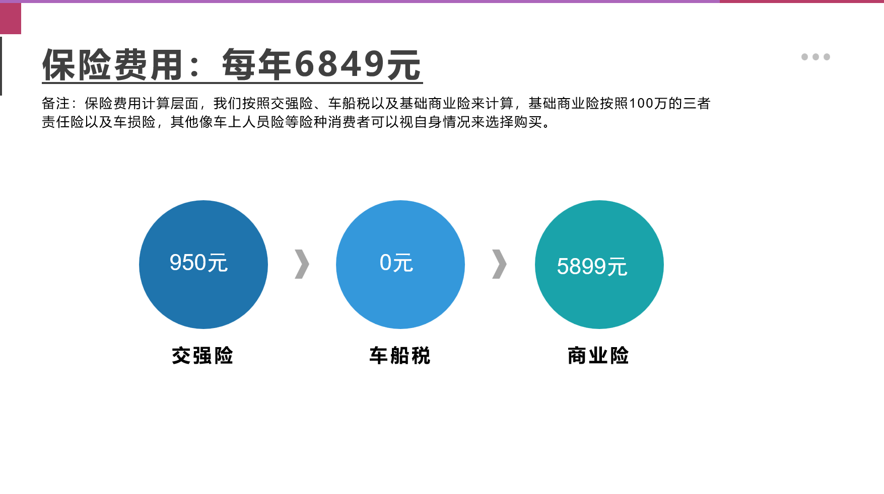 保险费用计算层面,我们按照交强险、车船税以及基础商业险来计算,基础商业险按照100万的三者责任险以及车损险,其它像车上人员险等险种消费者可以视自身情况来选择购买。我们的价格不考虑多年不出险的市场折扣价。
