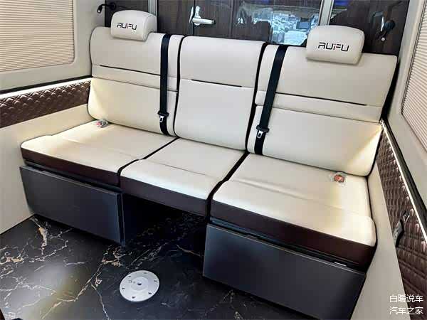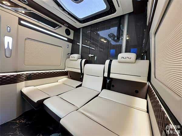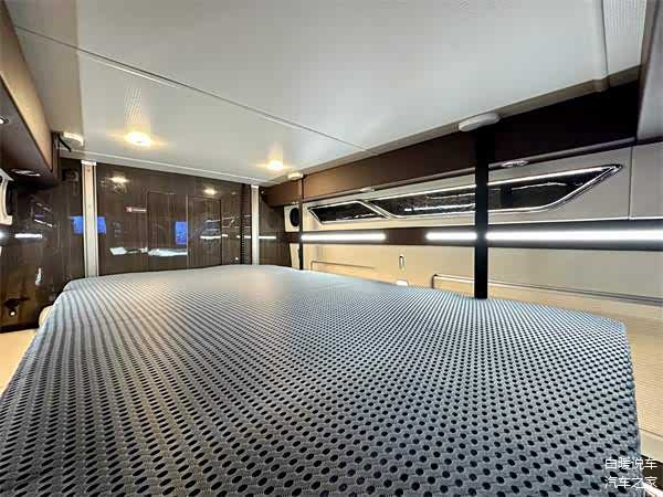 • 卧室区域:车尾可设置横置大床铺,尺寸可达2.05m×1.3m,也可将后排的U型沙发座椅组成沙发拼床,还可降下电动升降床,形成可容纳1-2人的床铺。