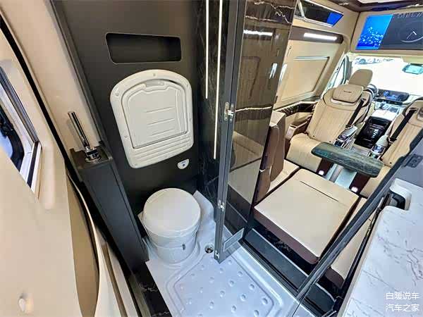 • 卫浴间:位于车尾或车内中部,配置有房车专用马桶、一体式洗脸盆、防水木板、梳妆镜和抽拉式水龙头等。