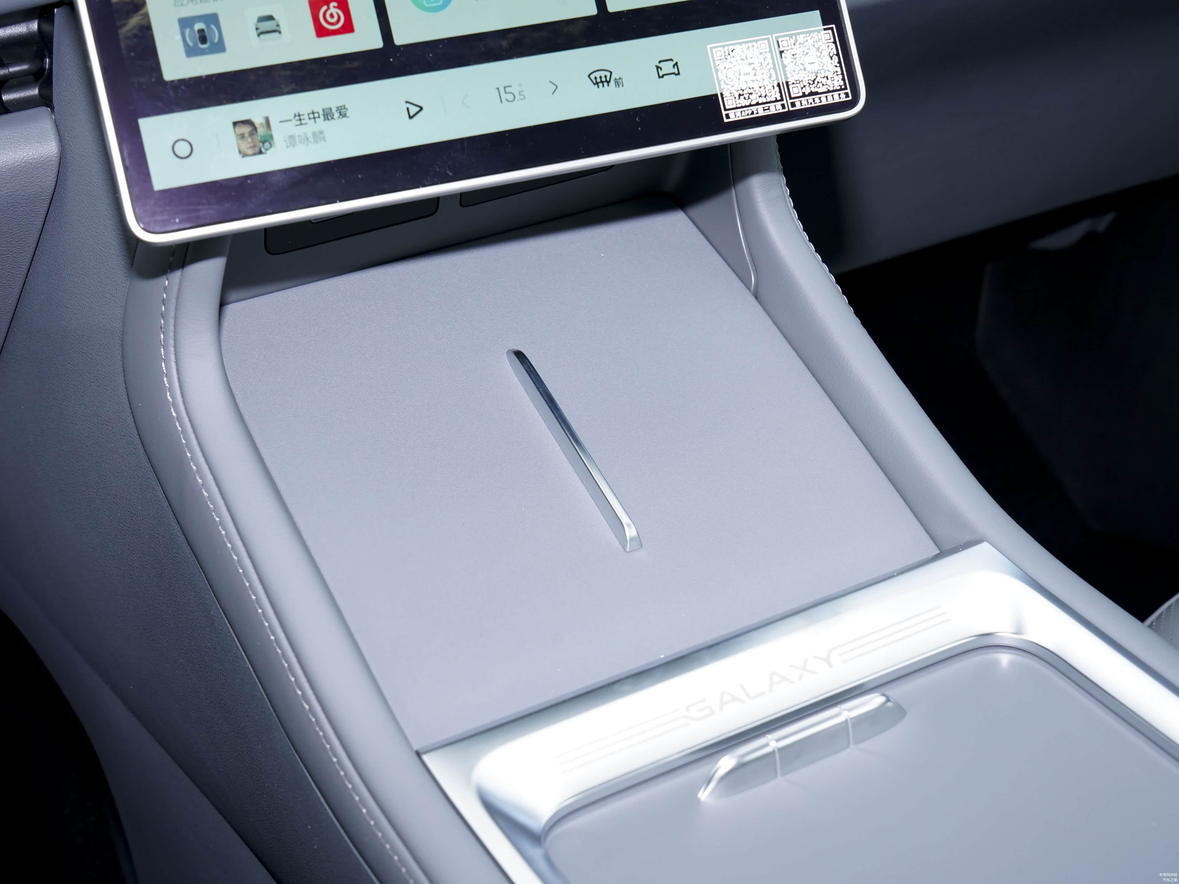 进入车内,银河L7采用非对称式布局,左侧的屏幕位置略高,右边略低,悬浮式中控屏向驾驶员一侧倾斜,但整体依旧给人很强的包裹感,车内标配10.25英寸液晶仪表与13.2英寸竖置中控屏,从次低配开始,增加了一块16.2英寸的副驾娱乐屏,另外顶配和次顶配车型还提供了25.6英寸的AR-HUD抬头显示,四屏联动覆盖驾驶信息、导航、娱乐等功能,形成沉浸式交互体验,中控台的软质包覆面积较大,搭配银色金属饰条与钢琴烤漆面板,显著提升了质感。
