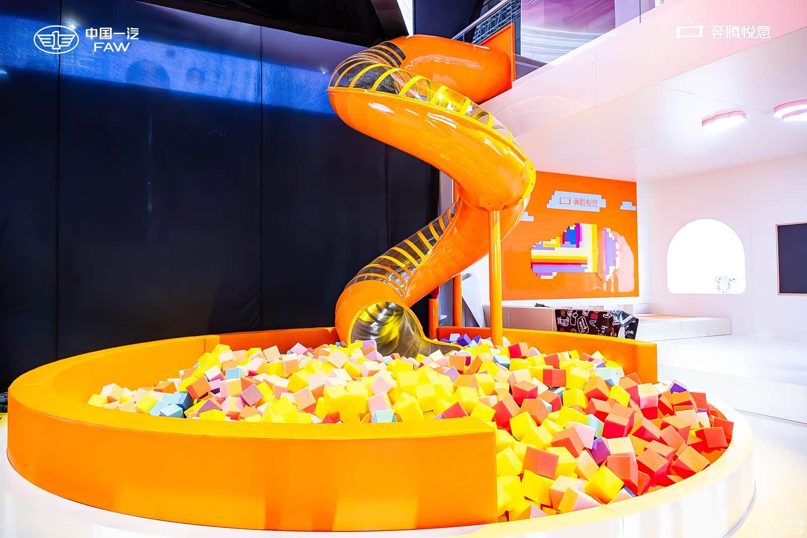 在上海车展的喧嚣中,各大车企忙着秀肌肉、晒黑科技,有人搬出激光雷达堆砌算力,有人用AR座舱打造未来感,唯有一汽奔腾的展台飘着咖啡香,传来孩子的笑声——360°螺旋云轨滑梯上,宝妈宝爸终于不用轮流看娃,而是能悠哉地坐在环绕秋千上,看自家孩子在“悦意新天地”里撒欢。