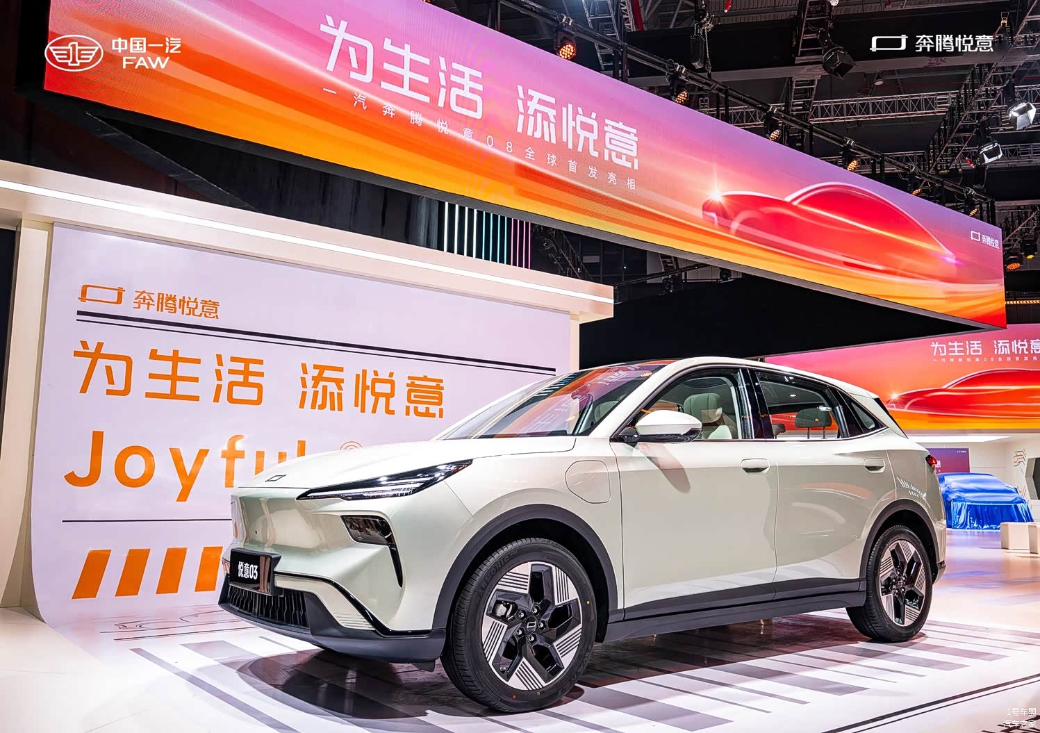 这种“去商业化”的展台设计,本质上是在传递品牌价值观:奔腾悦意不是冰冷的交通工具,而是“为生活添悦意”的伙伴——你可以开着悦意03带全家去郊游,用悦意08的大空间装婴儿车,开着悦意07长途自驾不用担心续航,下车后还能在展台喝杯咖啡,享受片刻松弛。