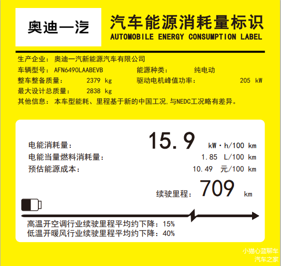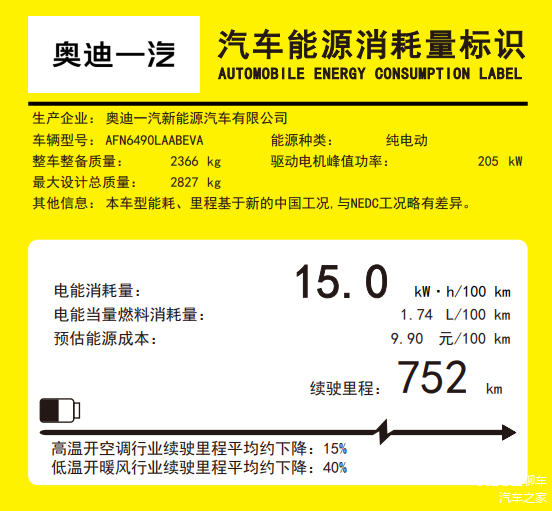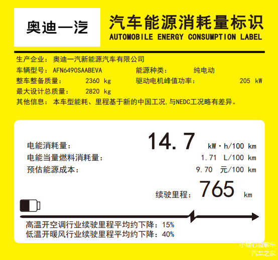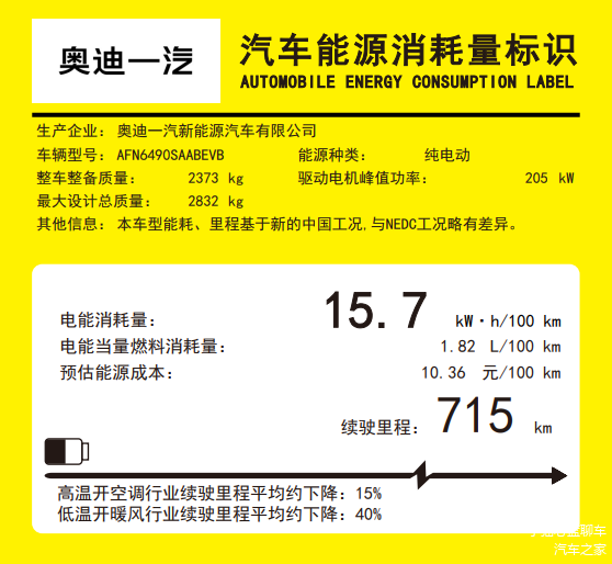 动力系统方面,新车目前公布的车型均采用单电机,电动机生产企业为AudiHungariaZrt(奥迪匈牙利公司),型号为TZ210XYECC,最大功率205kw。动力电池方面,新车采用镍钴锰三元锂蓄电池,单体生产企业为宁德时代新能源科技股份有限公司,总成生产企业为奥迪一汽新能源汽车有限公司。
