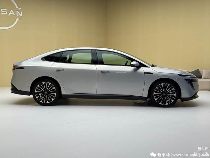 车身侧面,日产N7采用时尚的溜背式设计,配合无框车门及隐藏式门把手,整车风阻系数低至0.208,彰显出优秀的空气动力学表现。入门车型配备17英寸多条辐低风阻轮辋,而其他车型则标配19英寸轮辋。消费者还可以额外花费1500元升级"运动包",包含19英寸五辐花瓣轮辋、运动卡钳罩及迎宾踏板,进一步提升整车运动感。