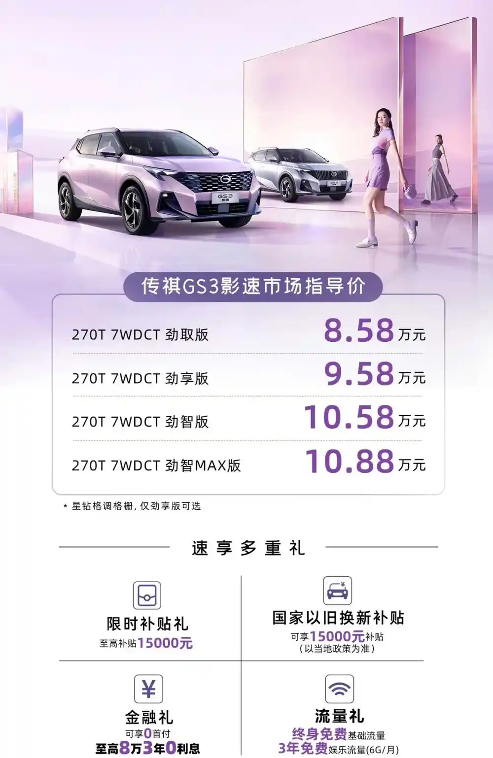 4月28日,广汽传祺宣布2025款传祺GS3·影速正式上市。新车作为一款小型SUV,共推出4个配置版本,官方指导价为8.58万至10.88万元。