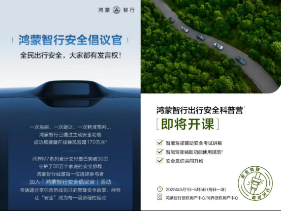 而华为这边也在前段时间推出了“鸿蒙智行安全倡议官”活动,鼓励用户带话题发帖分享安全故事和经验,发出自己的安全宣言,在正确引导舆论的同时宣传了自身车型的主动安全性能。并且五一期间鸿蒙智行每天还将在用户中心举办“鸿蒙智行出行安全科普营”课程,囊括了智能驾驶辅助安全考试讲解、功能使用规范以及安全意识等相关知识。