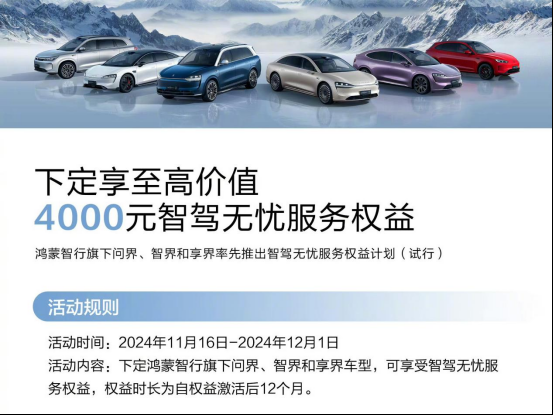 而华为大面积铺开智驾险的时间则要更早一点,从去年11月份开始,鸿蒙智行旗下很多车型购车时都会赠送价值4000元的“智驾无忧”服务权益,提供至高300万或500万的保障,时长为12个月,涵盖了行车和泊车的六大场景。
