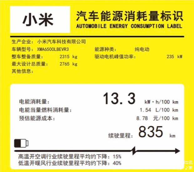 近日,工信部公示信息显示,小米汽车科技有限公司旗下小米YU7单电机车型新增835公里续航版本(CLTC工况暂未标注),电池系统能量密度及能耗表现进一步优化。