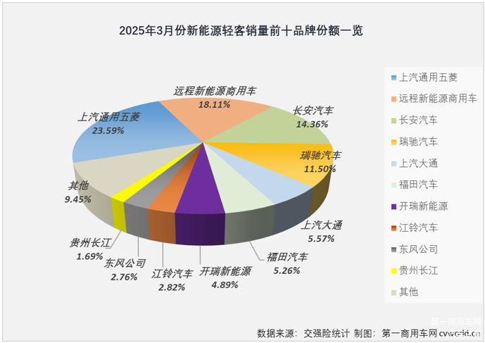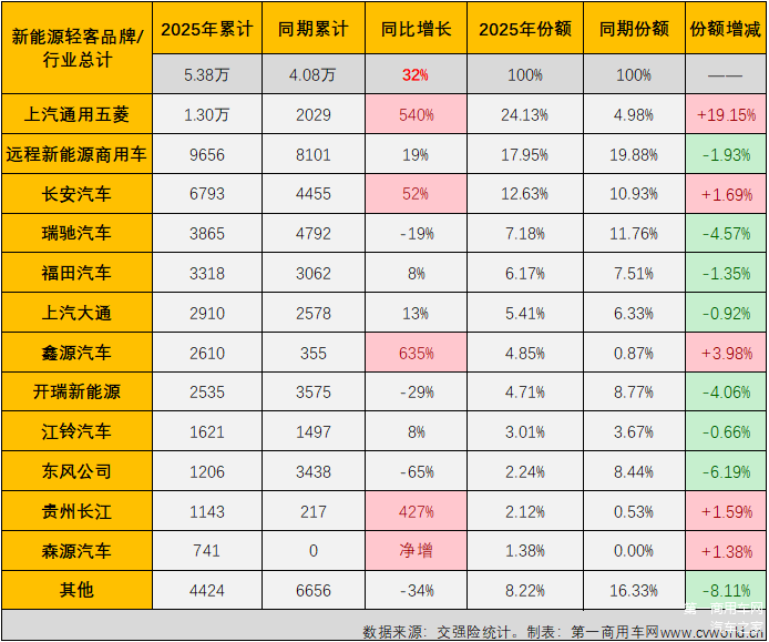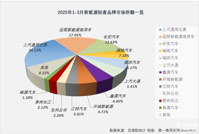 上表可见,2025年1-3月,新能源轻客累计销量实现增长的企业占多数。其中,上汽通用五菱、鑫源汽车和贵州长江由于上年同期基数较小,同比分别暴涨了540%、635%和427%;长安汽车同比大增了52%,增速高于1-3月新能源轻客市场整体增速;远程、福田、大通、江铃等企业同比实现增长,但增速低于市场整体增速,跑输市场“大盘”;与此同时,有3家企业今年一季度销量同比出现两位数下降,下滑最严重的企业同比下降了65%。
