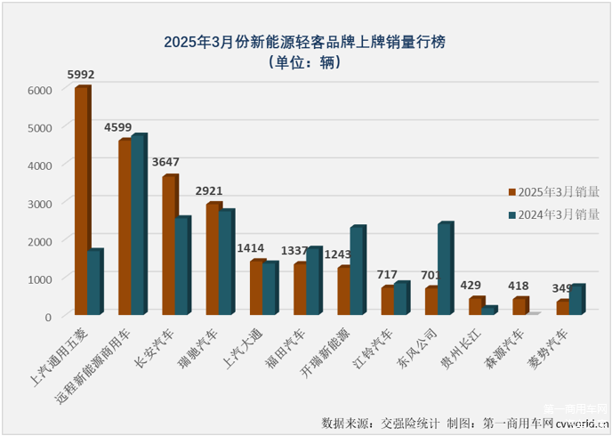 2025年3月份,国内新能源轻客实销2.54万辆,其中销量超过200辆的企业有15家,销量破千的企业有7家,进入月销量榜前十的门槛是420辆。