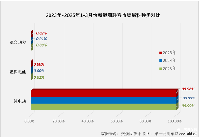 从燃料种类看,最近3年,新能源轻客技术路线均以纯电动为主,2025年1-3月纯电动车型占比达到99.98%,与2024年同期相比略微下降(下降了0.01个百分点,如上图)。第一商用车网注意到,纯电动车型在新能源轻客市场是绝对大头的存在,相比在新能源轻卡、新能源重卡市场上,燃料电池和混合动力车型还有或多或少的“存在感”,新能源轻客市场上这两类产品几乎可以忽略不计(目前仅汽油混合动力轻客有十余辆上牌,燃料电池轻客销量仍然为0)。