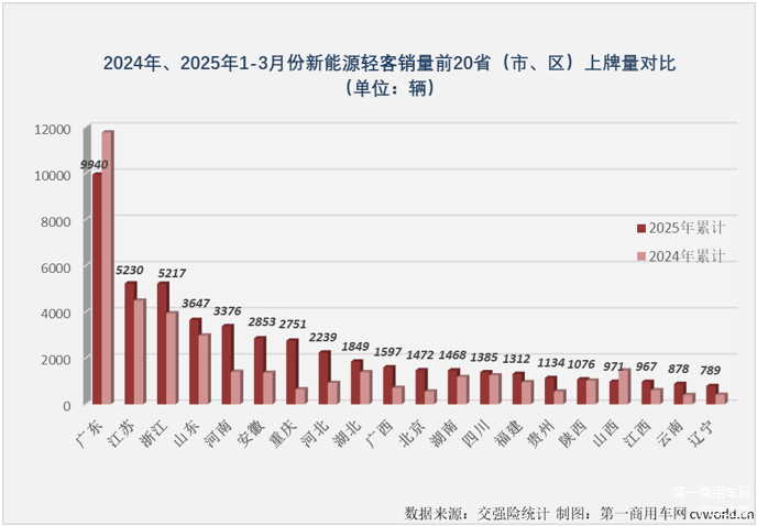 2025年1-3月,全国除港澳台外的31个省(直辖市、自治区)都有新能源轻客上牌,全国已有28个省(直辖市、自治区)新能源轻客上牌量超百辆,上牌量超1000辆的省(直辖市、自治区)有16个,其中广东省上牌量已接近万辆,达到9940辆,占今年一季度新能源轻客全国上牌量的18.47%。