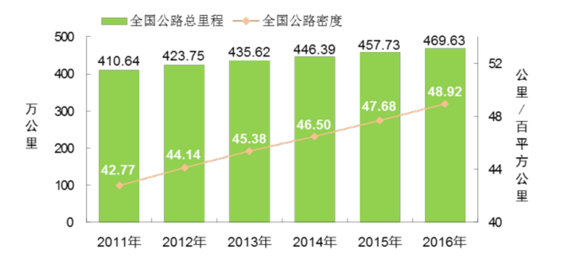 交通部在2017年公布的统计数据显示:2016年中国的机动车国道日行驶总量为20.7亿车公里,这个数字比2015年增长1.4%,以一年365天计算,中国机动车的国道年总行驶里程大约在7500亿车公里。目前我国机动车保有量为2亿辆,结合国内情况和参照美国数据,通常一辆车年行驶里程1到2万公里之间,因此中国所有车辆一年总行驶里程在2万亿公里以内。