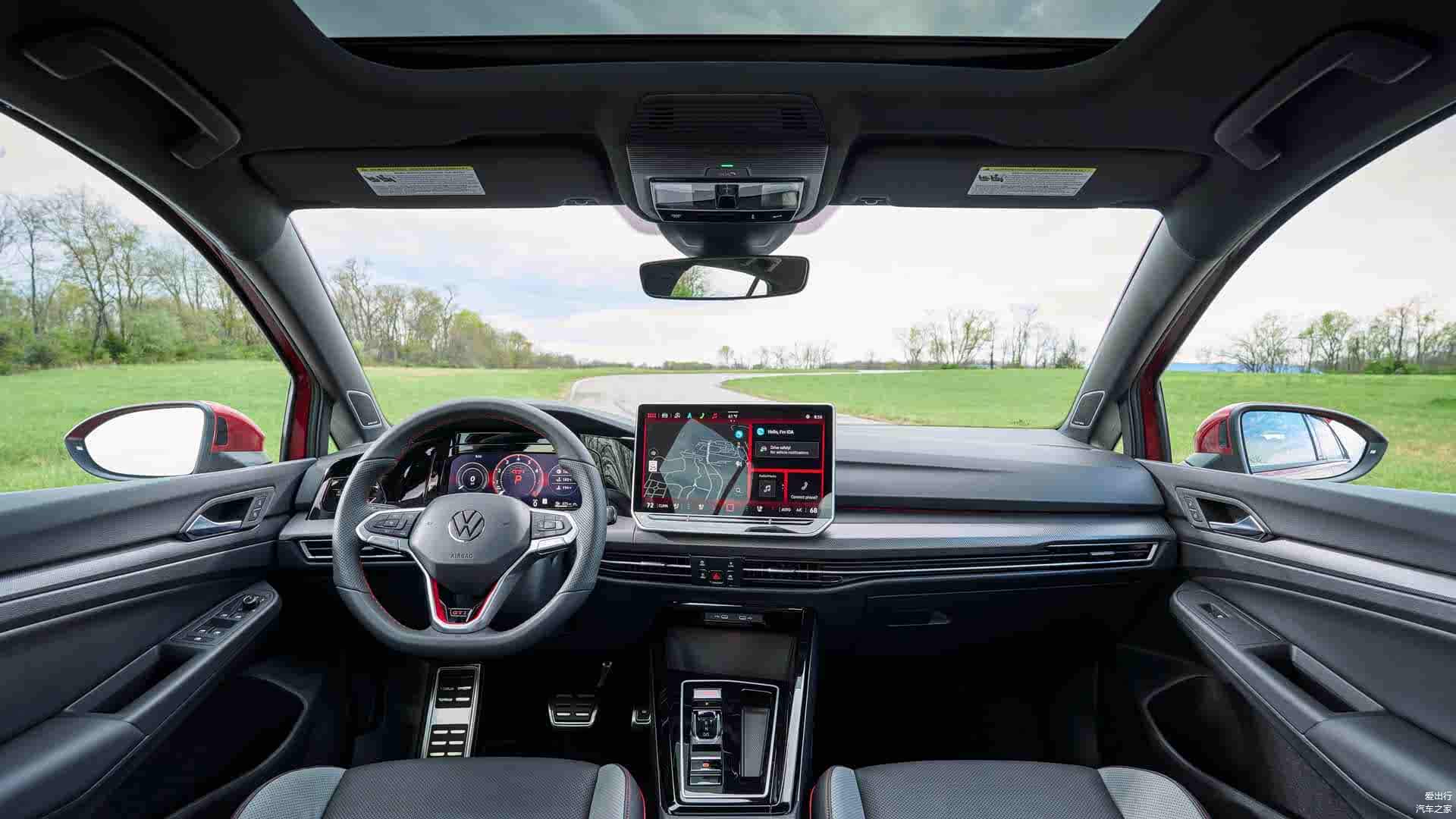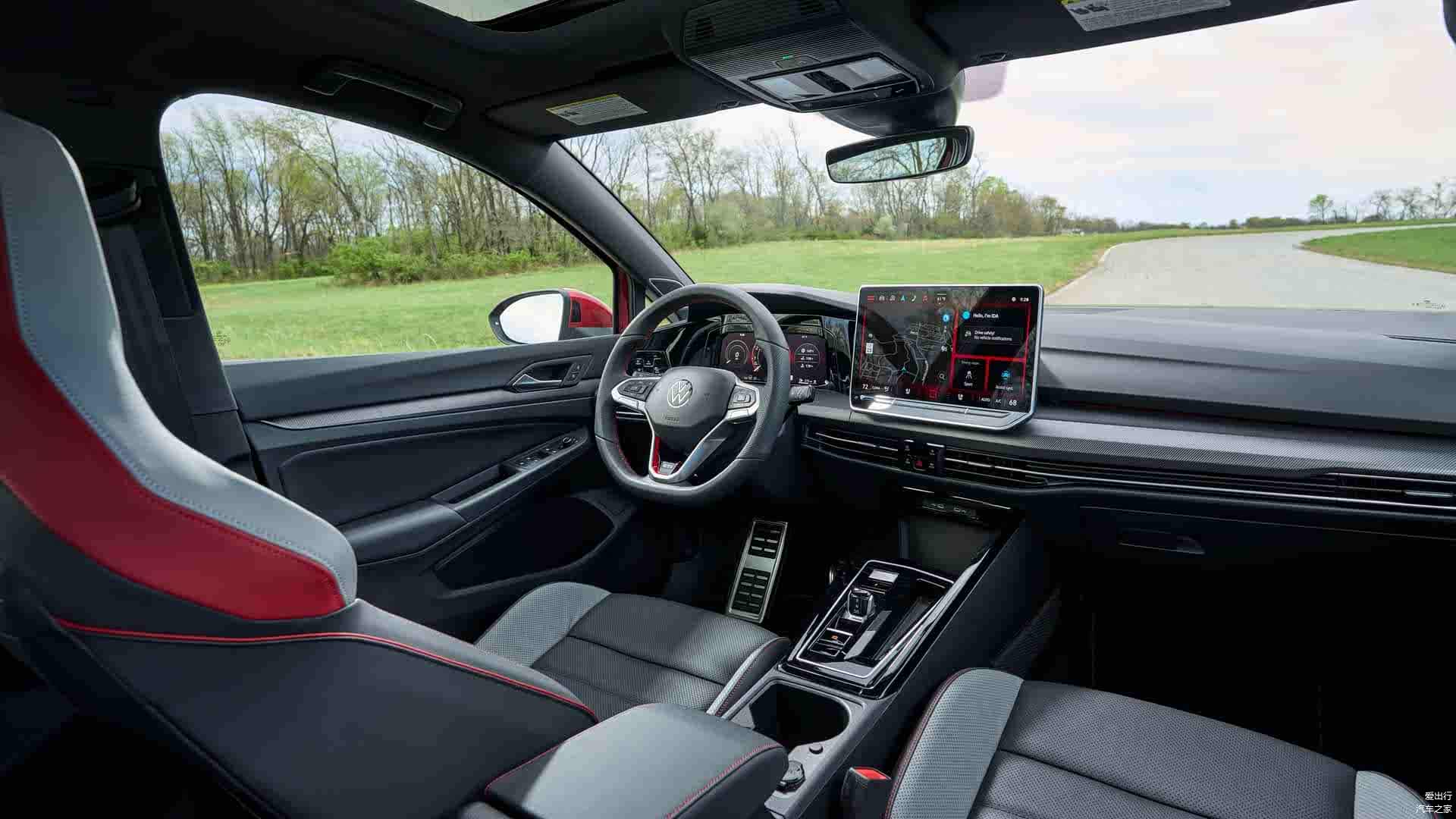 内饰升级是2025款高尔夫GTI的核心亮点之一。中控台采用悬浮式12.9英寸OLED触控屏,分辨率达2K级别,搭载最新MIB4车机系统,支持无线CarPlay、Android Auto及5G车联网功能。屏幕向驾驶者倾斜8°,配合物理空调控制旋钮与触控式方向盘按键,实现了科技感与实用性的平衡。贯穿式空调出风口下方,30色可调氛围灯带与GTI专属红色缝线形成呼应,营造出沉浸式驾驶舱氛围。