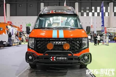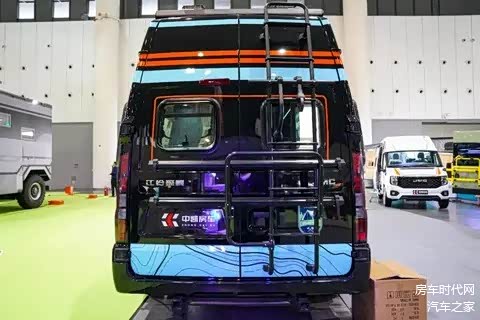 车辆外观采用了时尚的拼色方案,炫酷亮眼,前额头配置了FRP定制开模天窗,能够为车厢内部提供更为充足的采光,车顶设有全铝合金行李架,尾部则配置了一体成型铝合金爬梯与自行车架,随车装备有中凯定制脱困板以及固定支架,设施实用丰富。