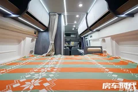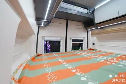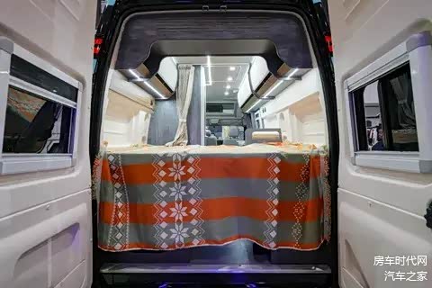 床铺上方为储物吊柜设计,下方也可用来储物,能够满足用户长途旅居的收纳需求。驻车后可将尾部双开门打开,形成贯通的车内空间。