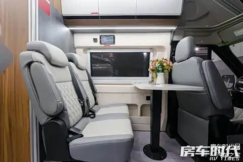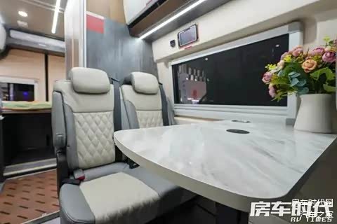配置有M1类乘用车顺向双人座椅,采用NAPPA真皮包覆,保障了乘坐的舒适性。座椅前方搭配有气动升降桌,复合岩板材质很符合内饰的整体调性。腿部位置还设计有多个储物格,便于用户存放杂物。