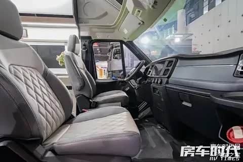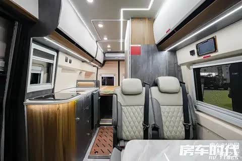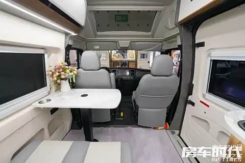 车内布局从前到后依次为驾驶室、会客区、厨房区、卫浴间以及尾置横床,其中卫浴间采用了伸缩式设计,提升了空间利用率。车内灯光系统丰富,配置有顶部主光源以及分区独立控制的局部氛围灯组,保障了多时段的采光需求。