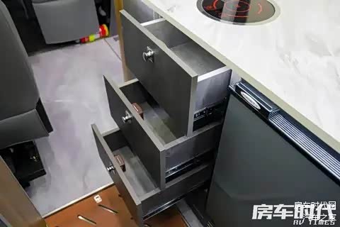 功能区布置在车厢中门一侧,采用了高光防水防污厨柜台面,区域内设置了方形不锈钢带盖水槽及可折叠冷热双出水龙头,配置有50L单开门房车专用冰箱(冷藏45L/冷冻5L)、15L房车专用微波炉与触控式镶嵌电磁炉,能够满足用户旅居的烹饪需求。上下均设计有储物空间,储物柜配置防脱轨房车专用橱柜锁具,行车时更为安全稳固。