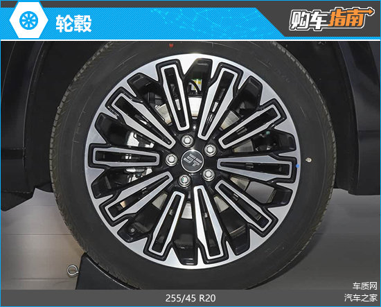 轮毂方面,入门车型精英版 五座采用19英寸轮毂,匹配235/55 R19规格轮胎,其他车型配备20英寸峰影轮毂,匹配255/45 R20规格轮胎。