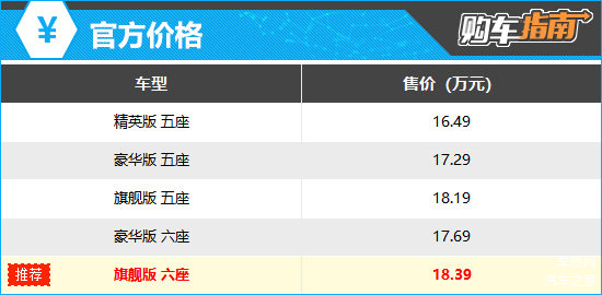 在目前在售的车型中,我们推荐18.39万元的旗舰版 六座。作为顶配车型,其不仅配置水平较高,还采用六座设计,可以给第二排乘客提供更好的乘坐舒适性且实用性也优于五座版车型。推荐车型较低一级别车型的主要变化在于座位数的增加和第二排舒适性的提升,多出第二排座椅电动调节、第二排右侧零重力座椅、后排独立空调等,虽然也少了副驾驶位电动座椅记忆功能等配置,但对舒适性影响不大。第二排乘坐舒适性和实用性明显提升,售价却仅增加0.2万元,性价比较高。