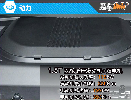 动力方面,新车搭载鲲鹏第五代1.5TD超能混动专用发动机和混动专用2挡DHT变速箱,发动机热效率达到44.5%,最大功率115kW,最大扭矩220N·m,电动机总功率199kW,电动机总扭矩395N·m,系统综合功率314kW,综合扭矩615N·m。2挡DHT变速箱采用P2+P3双电机驱动架构,兼顾节能性和动力性。